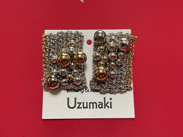 「あみじのカケラ」つぶつぶピアスをご覧いただきましてありがとうございます。 こちらのアクセサリーは金属のように見える糸を編んで制作しております。 「あみじのカケラ」の「あみじ」とは「編み地」のこと。 1本の糸を様々な技法で編み、作られるものを「編み地」といいます。 その編み地の一部分のことを「カケラ」と呼びアクセサリーにしております。 通常、セーターやストール、帽子等その他たくさんのニット製品は編み地の集合体で出来たものです。 その編み地に愛着があることから生まれたのが「あみじのカケラ」というアクセサリーです。 編み方は”細編み”(こまあみ)という方法で技法としては基本的な編み方となります。 編み方は無数にあり模様も様々。 1本の糸を丁寧にゆっくりじっくりと編み、そのデザインで製品の印象が決まるほど重要なのが編み地です。 モチーフを作ることも可能な編み物ですが、技法の難易度やモチーフに引っ張られないアクセサリーにしたいと考え、あえてとてもシンプルな編み地をアクセサリーにしました。 【つぶつぶについて】 つぶつぶの部分は糸にビーズを通して編み込んでおります。 シルバーのあみじにゴールドやシルバーのつぶが良いアクセントのピアスです。 【素材】 レーヨン 73% ナイロン 14% 分類外繊維(和紙) 13% 【お取り扱いについて】 金属に見える糸は水や熱に弱い素材のため、編み上がった編み地をコーティングしております。 汗や雨に濡れた場合は水分を拭き取るなどして水濡れにはご注意ください。 なお、保管する場合はケースに入れてくださいますようお願いいたします。 ※コーティングは施しておりますが経年で多少のお色の変化はございます。(色が薄くなる等) ビーズのお色も、日光に当たることや経年によりお色が変わっていくことがございます。 最初の色味と何年か使用後の色味の変化までお楽しみいただければ幸いです。