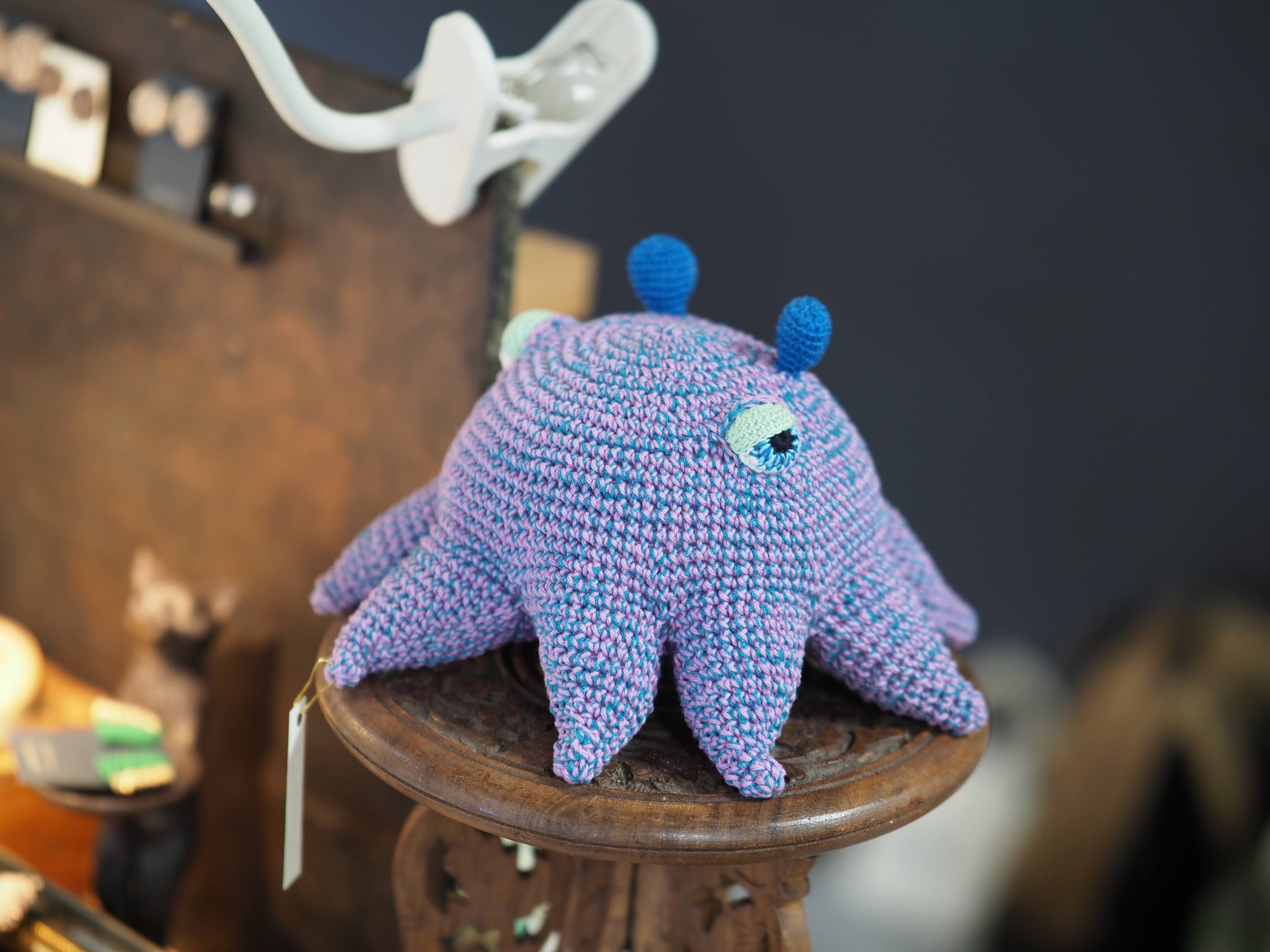 コットン糸で編んだキモカワあみぐるみです。 足がはえちゃったおキノコさんに、ブルーのミニタコぐるみ、そしてたましいくん。 全て手編みとなりますので、サイズや目の表情などそれぞれ違います。 違いを楽しんでいただけましたら幸いです♪